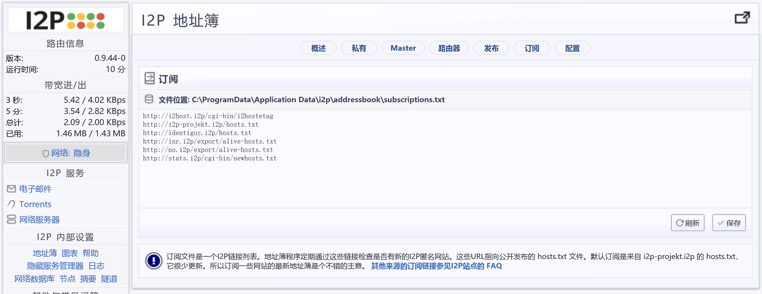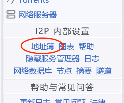 在“配置首页”,点击 I2P 内部设置下方的“地址簿”,如图: