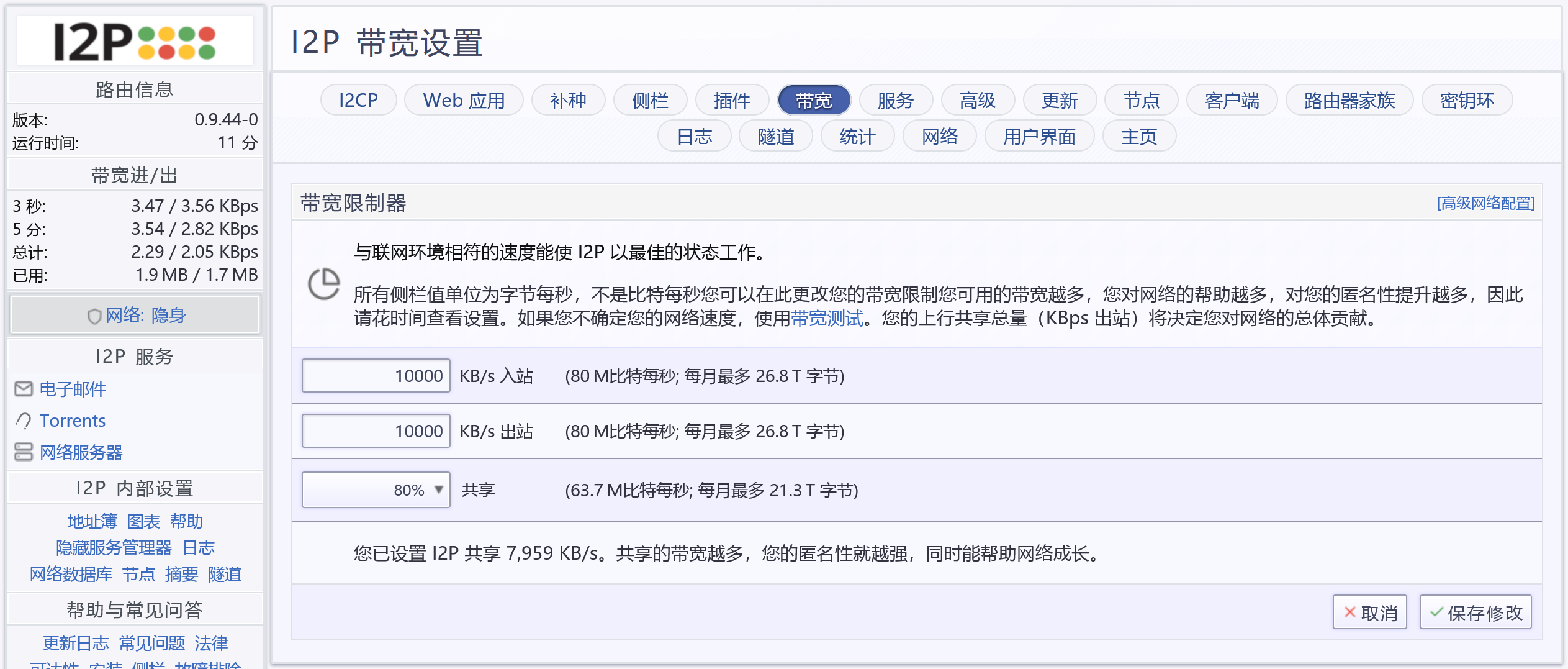 正确配置带宽参数,能够让 I2P 更好的利用你的宽带,并且不影响其他网络应用的网速,比如看网络电视。