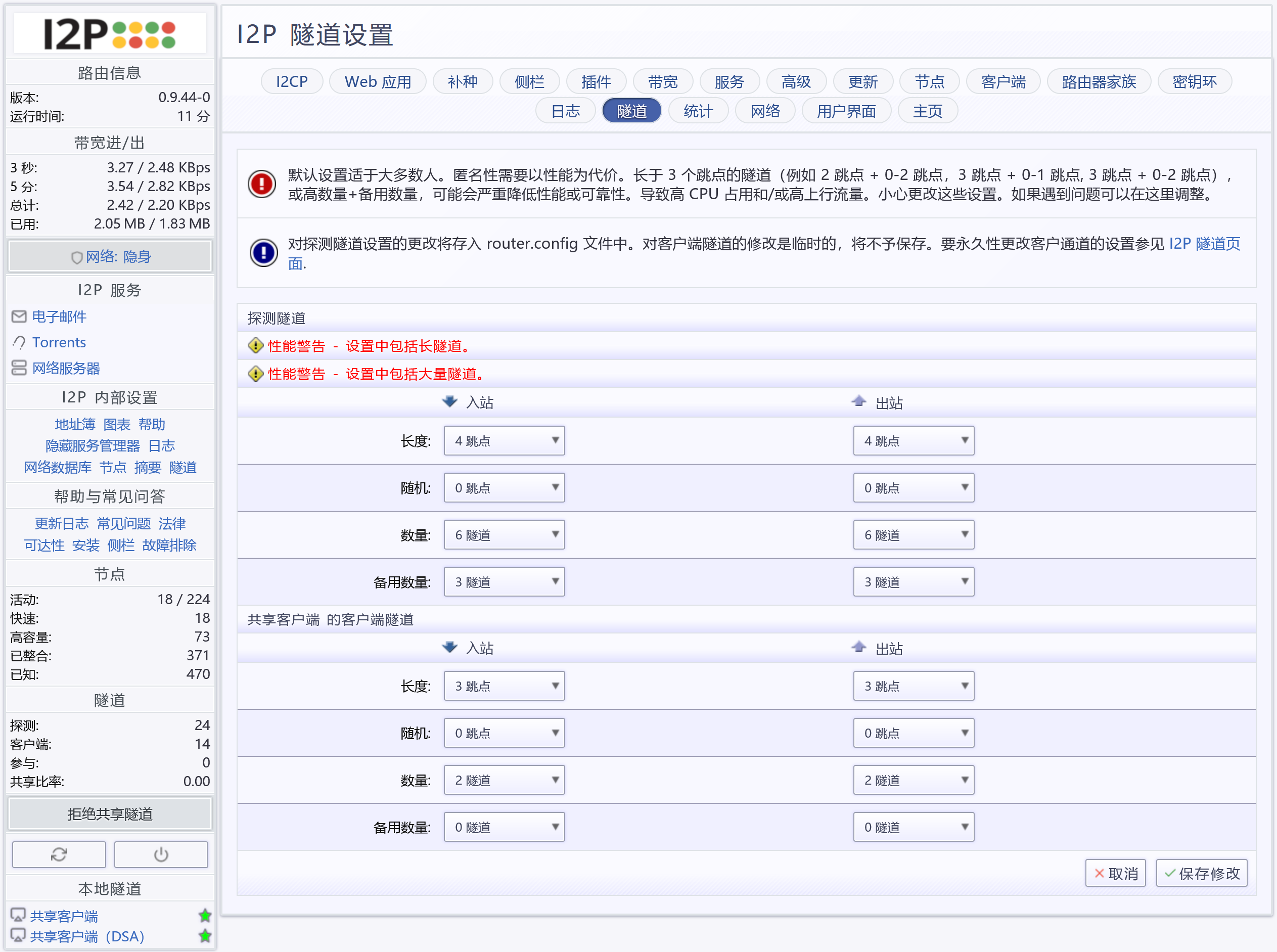 - 共享客户端的客户端隧道 将入站和出站的“长度”设置小一点,访问 I2P 的资源会更快,设置大一些别人更不容易找到你。“数量”设置多一些,资源连接更稳定。
