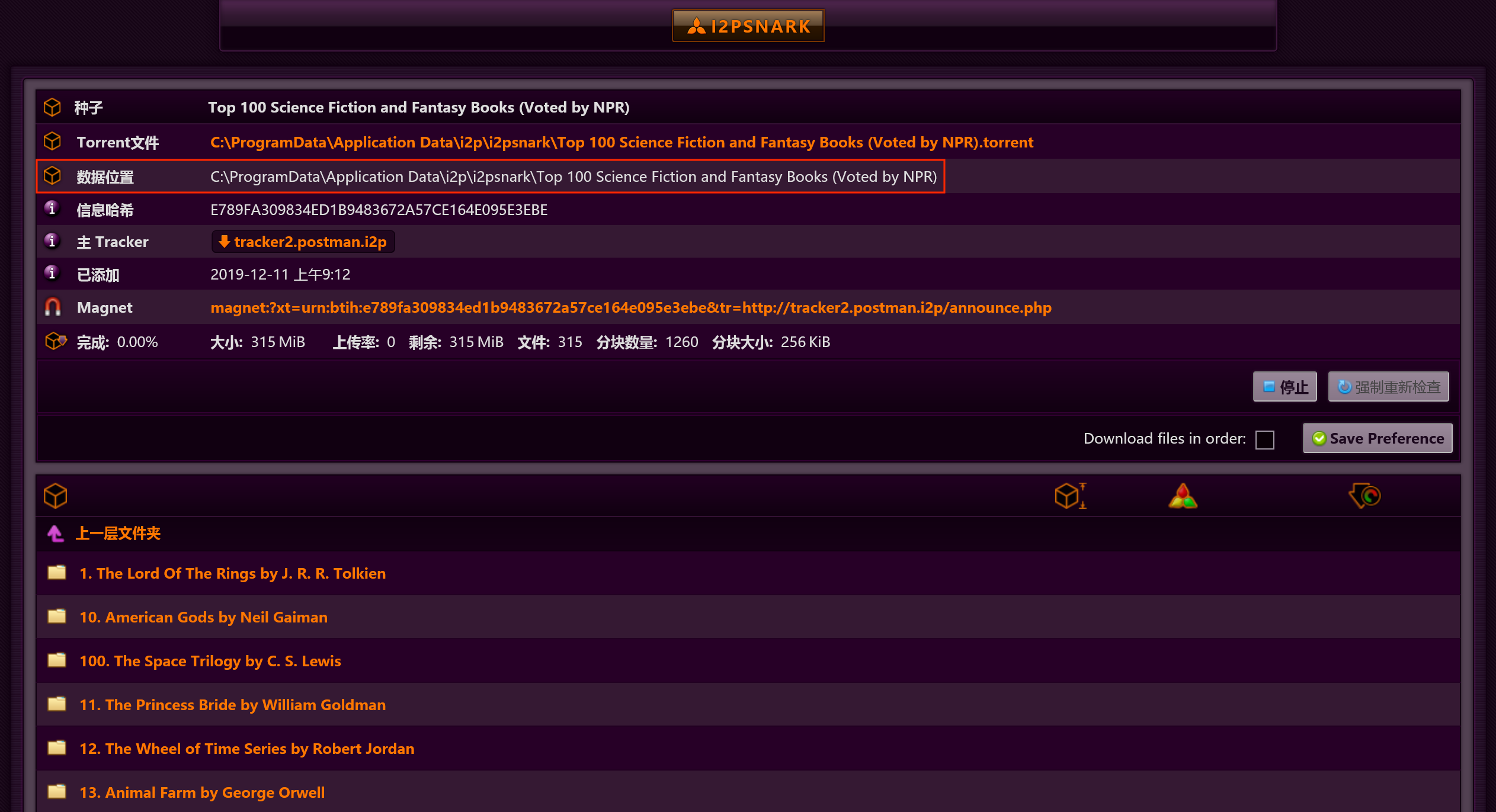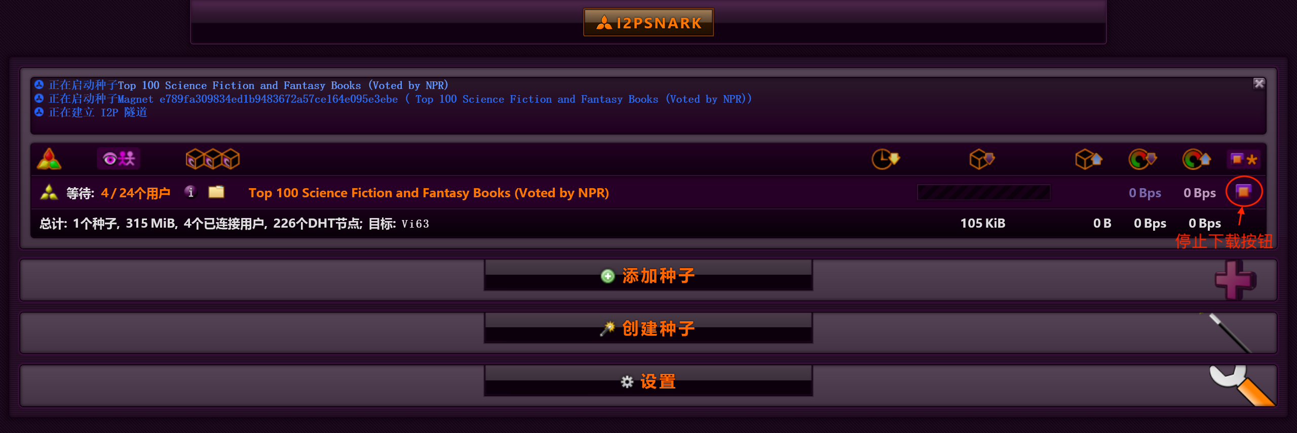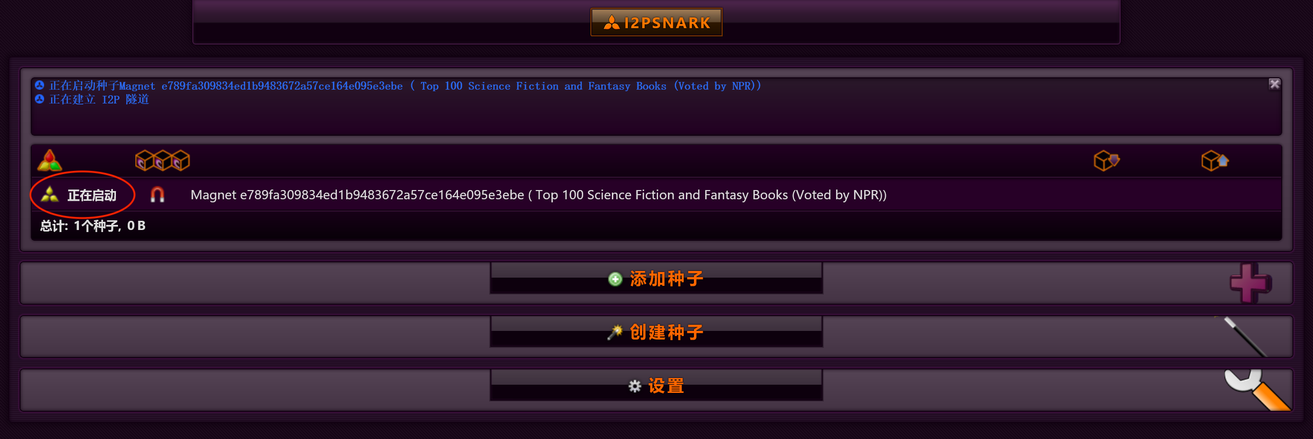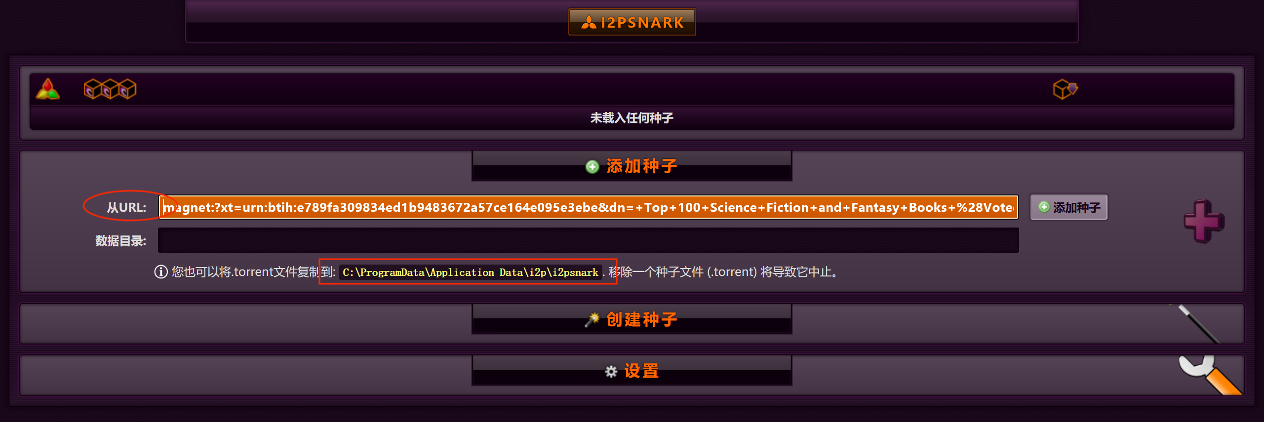 接下来有两种方式下载资源。一种方式是在种子站复制磁力链(教程)后粘贴到 I2PSnark 的“从 URL”输入框中,如上图。粘贴完成后,点击“添加种子”按钮。添加完成后,添加的种子就会显示在页面中: