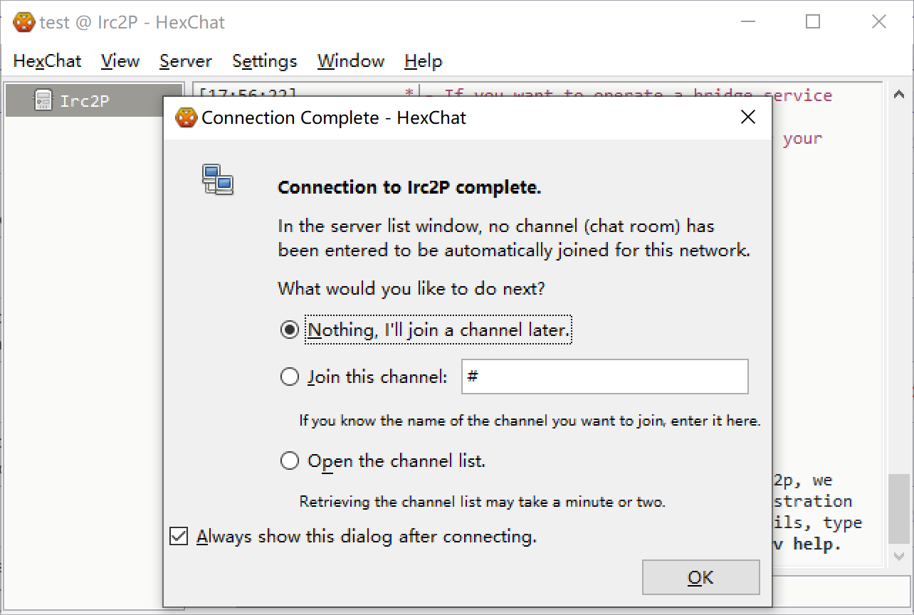 点击“Connect”窗口,HexChat 就会开始连接 Irc2P 网络。连接成功后,会出现如下窗口: