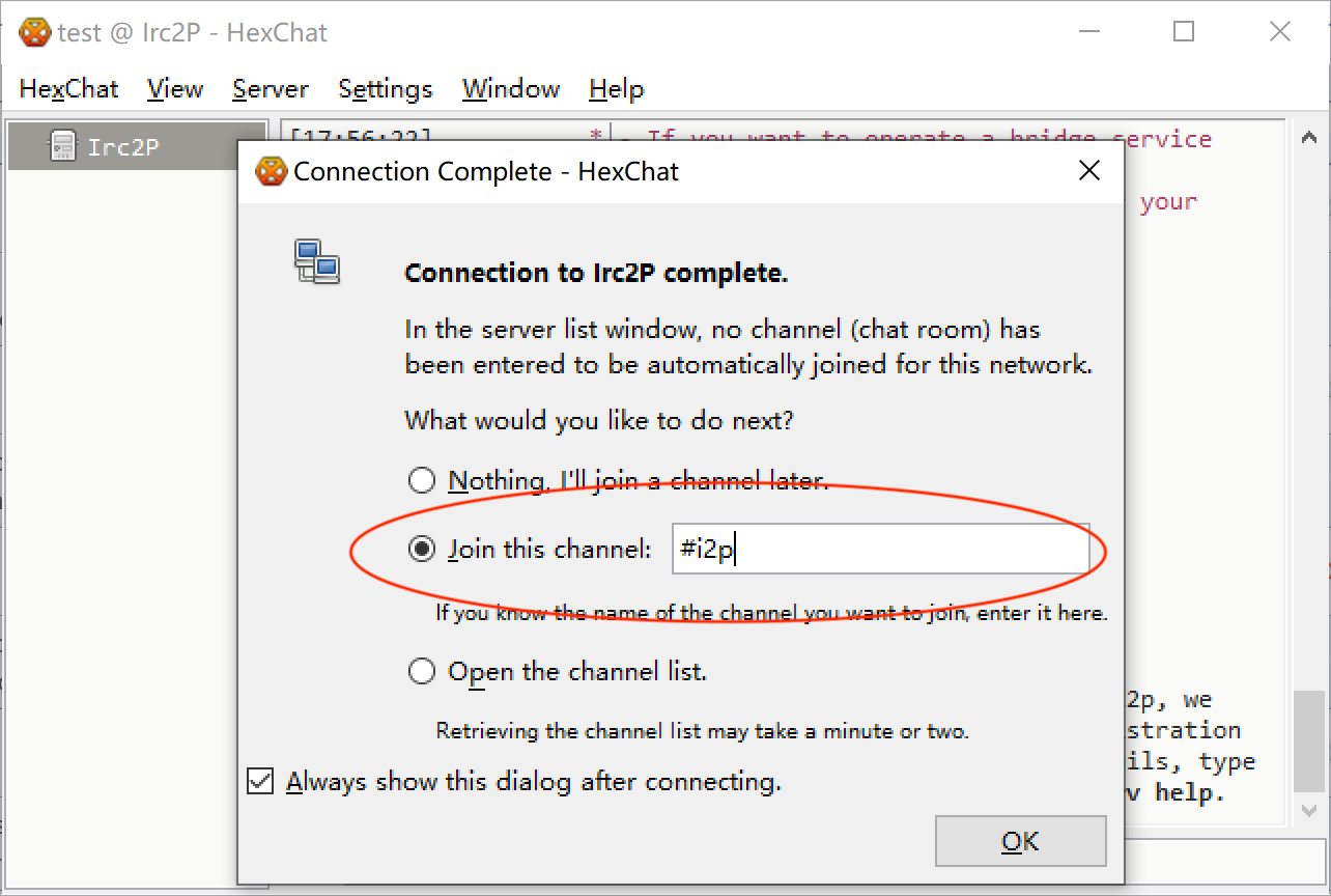点击“OK”按钮后,你就可以在 #i2p 频道聊天了。