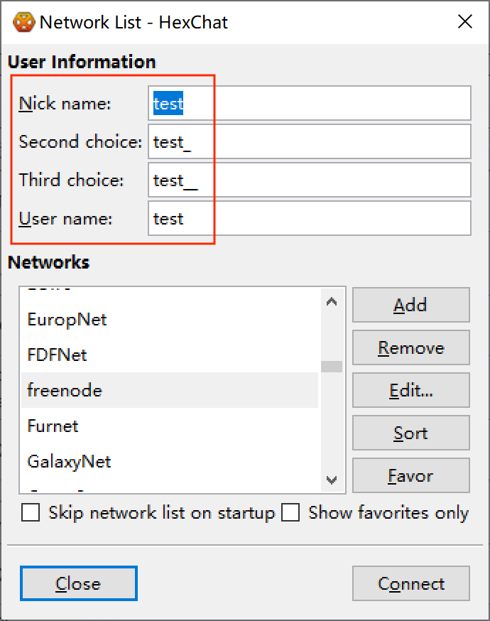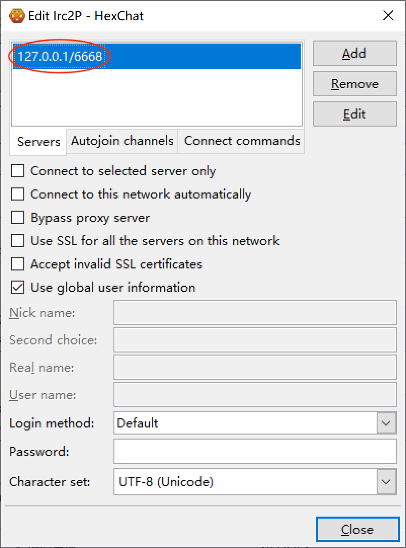 双击“newserver/6667”,将服务器修改为 127.0.0.1/6668。然后点击“Close”按钮关闭这个窗口,回到 Network List 窗口: